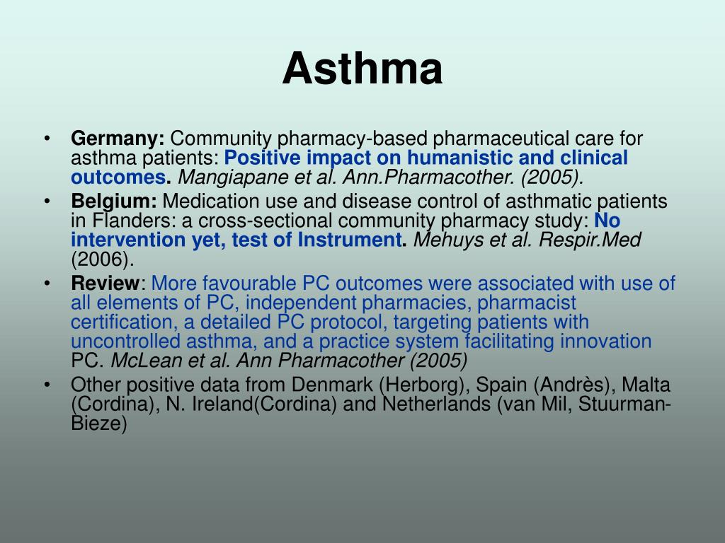 Asthma • Germany: Community pharmacy-based pharmaceutical care for asthma patients: Positive impact on humanistic and clinical outcomes. Mangiapane et al. Ann.Pharmacother. (2005). • Belgium: Medication use and disease control of asthmatic patients in Flanders: a cross-sectional community pharmacy study: No intervention yet, test of Instrument. Mehuys et al. Respir.Med (2006). • Review: More favourable PC outcomes were associated with use of all elements of PC, independent pharmacies, pharmacist certification, a detailed PC protocol, targeting patients with uncontrolled asthma, and a practice system facilitating innovation PC. McLean et al. Ann Pharmacother (2005) • Other positive data from Denmark (Herborg), Spain (Andrès), Malta (Cordina), N. Ireland(Cordina) and Netherlands (van Mil, Stuurman-Bieze)