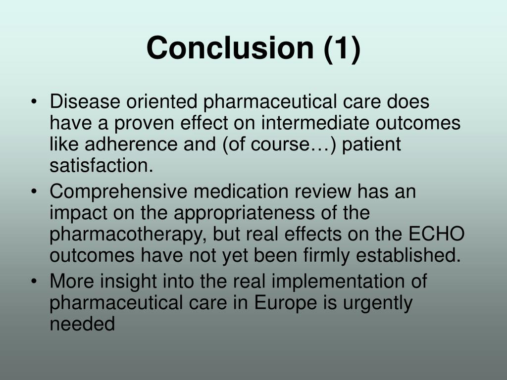 Conclusion (1) • Disease oriented pharmaceutical care does have a proven effect on intermediate outcomes like adherence and (of course…) patient satisfaction. • Comprehensive medication review has an impact on the appropriateness of the pharmacotherapy, but real effects on the ECHO outcomes have not yet been firmly established. • More insight into the real implementation of pharmaceutical care in Europe is urgently needed