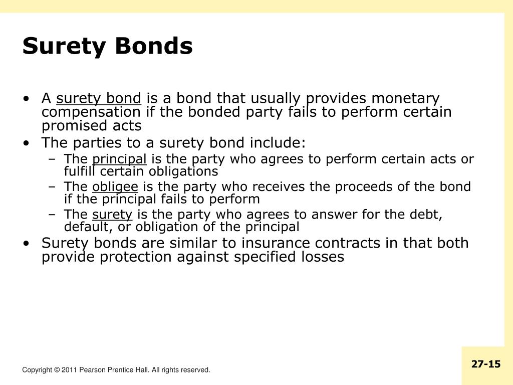 Surety Bonds A surety bond is a bond that usually provides monetary compensation if the bonded party fails to perform certain promised acts The parties to a surety bond include: The principal is the party who agrees to perform certain acts or fulfill certain obligations The obligee is the party who receives the proceeds of the bond if the principal fails to perform The surety is the party who agrees to answer for the debt, default, or obligation of the principal Surety bonds are similar to insurance contracts in that both provide protection against specified losses