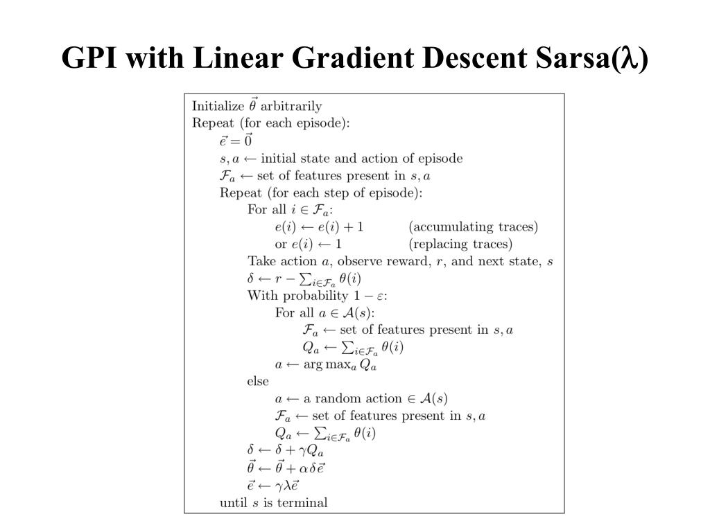 Learning state-action values The general gradient-descent rule: Gradient-descent Sarsa(l) (backward view): Training examples of the form: Control with FA