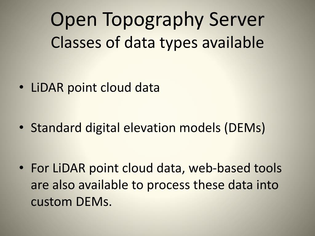 Open Topography ServerClasses of data types available • LiDAR point cloud data • Standard digital elevation models (DEMs) • For LiDAR point cloud data, web-based tools are also available to process these data into custom DEMs.