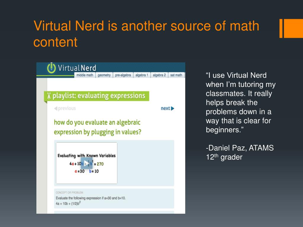 Virtual Nerd is another source of math content “I use Virtual Nerd when I’m tutoring my classmates. It really helps break the problems down in a way that is clear for beginners.” -Daniel Paz, ATAMS 12th grader