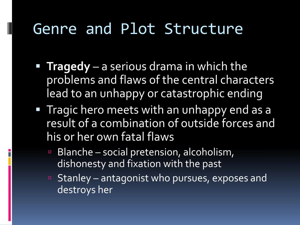 Genre and Plot Structure • Tragedy – a serious drama in which the problems and flaws of the central characters lead to an unhappy or catastrophic ending • Tragic hero meets with an unhappy end as a result of a combination of outside forces and his or her own fatal flaws • Blanche – social pretension, alcoholism, dishonesty and fixation with the past • Stanley – antagonist who pursues, exposes and destroys her