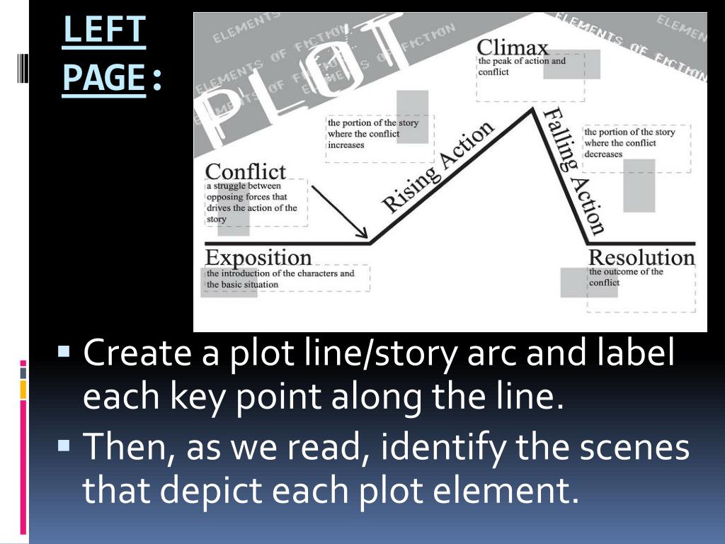 LEFT PAGE: • Create a plot line/story arc and label each key point along the line. • Then, as we read, identify the scenes that depict each plot element.