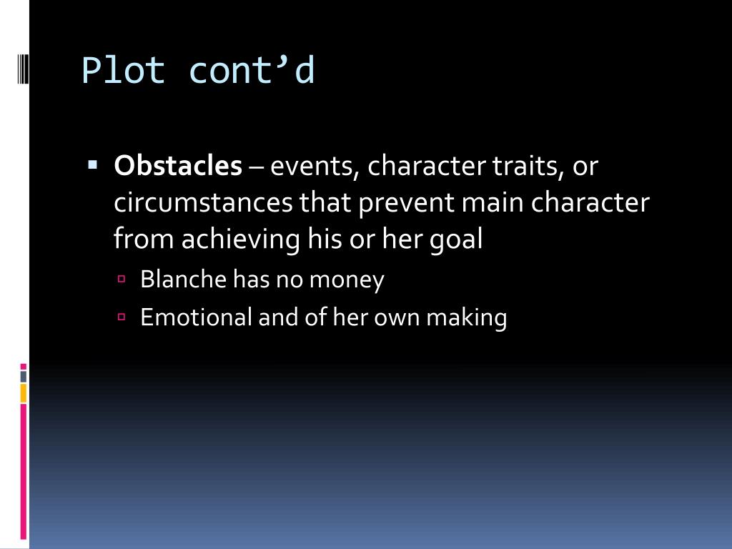 Plot cont’d • Obstacles – events, character traits, or circumstances that prevent main character from achieving his or her goal • Blanche has no money • Emotional and of her own making