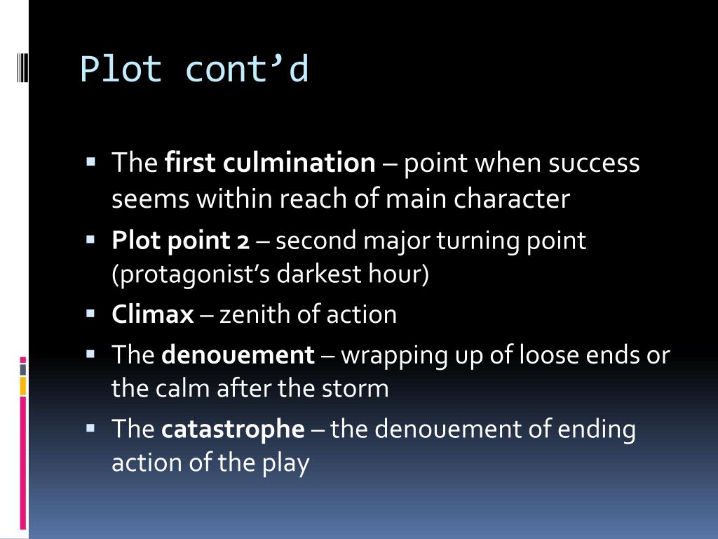 Plot cont’d • The first culmination – point when success seems within reach of main character • Plot point 2 – second major turning point (protagonist’s darkest hour) • Climax – zenith of action • The denouement – wrapping up of loose ends or the calm after the storm • The catastrophe – the denouement of ending action of the play