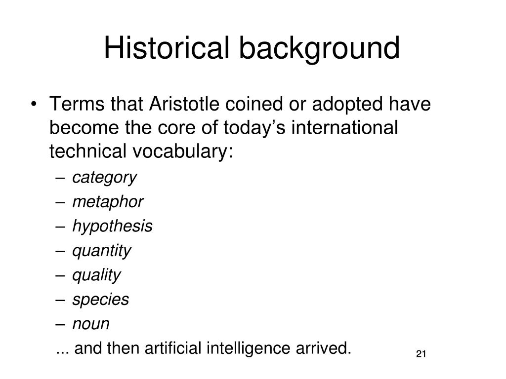 Historical background • Terms that Aristotle coined or adopted have become the core of today’s international technical vocabulary: • category • metaphor • hypothesis • quantity • quality • species • noun ... and then artificial intelligence arrived. 21