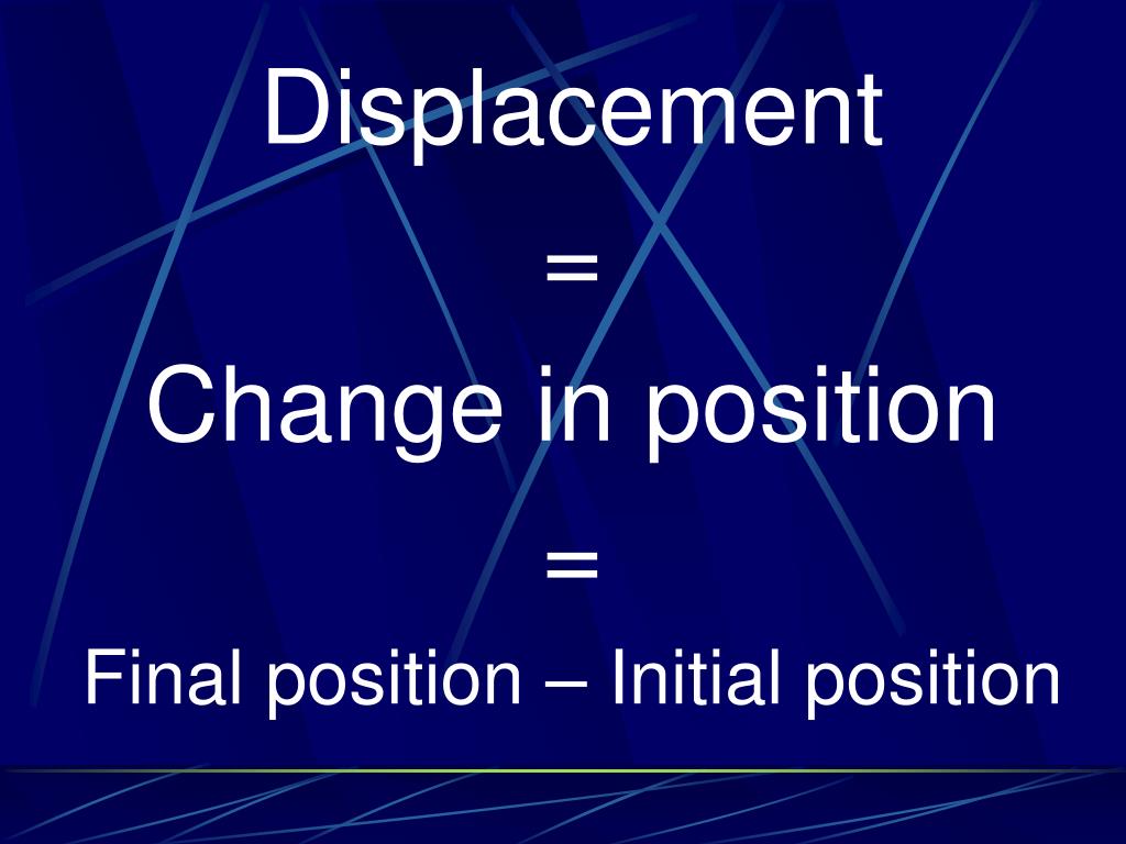 Distance How far an object has moved. No direction, therefore a scalar. Ex: 20 km