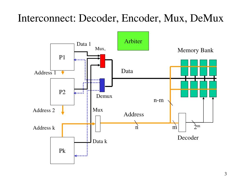Arbiter Data 1 P1 Mux, Memory Bank Data Address 1 P2 Demux n-m Mux Address 2 Address n m 2m Address k Decoder Data k Pk Interconnect: Decoder, Encoder, Mux, DeMux