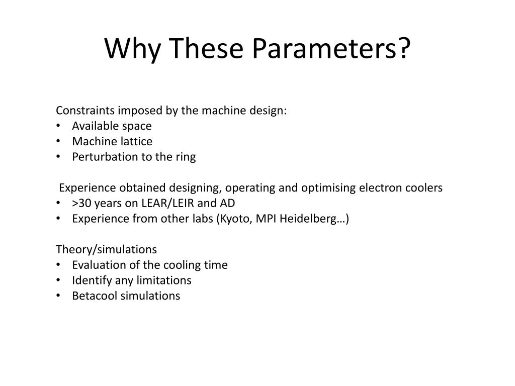 Why These Parameters? • Constraints imposed by the machine design: • Available space • Machine lattice • Perturbation to the ring • Experience obtained designing, operating and optimising electron coolers • >30 years on LEAR/LEIR and AD • Experience from other labs (Kyoto, MPI Heidelberg…) • Theory/simulations • Evaluation of the cooling time • Identify any limitations • Betacool simulations