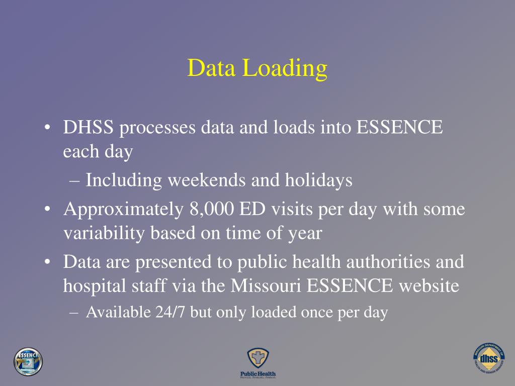Data Loading • DHSS processes data and loads into ESSENCE each day • Including weekends and holidays • Approximately 8,000 ED visits per day with some variability based on time of year • Data are presented to public health authorities and hospital staff via the Missouri ESSENCE website • Available 24/7 but only loaded once per day