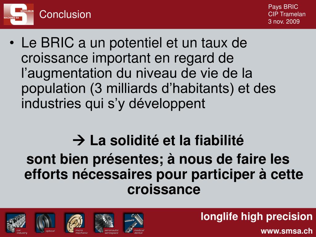 Conclusion • Le BRIC a un potentiel et un taux de croissance important en regard de l’augmentation du niveau de vie de la population (3 milliards d’habitants) et des industries qui s’y développent La solidité et la fiabilité sont bien présentes; à nous de faire les efforts nécessaires pour participer à cette croissance