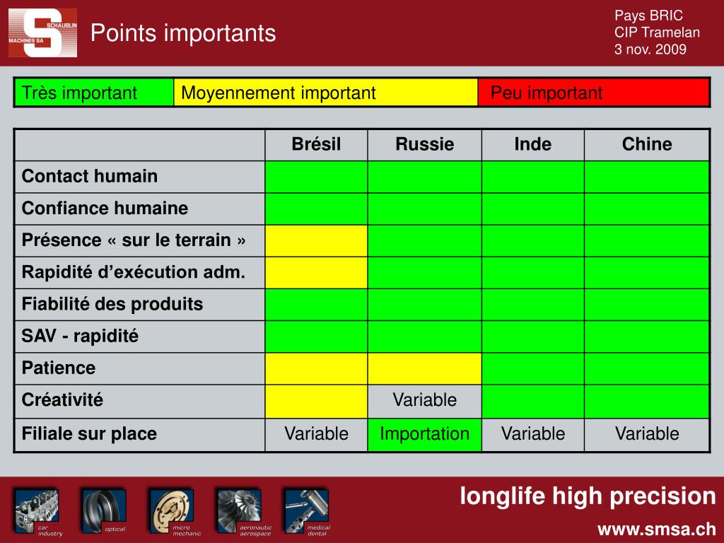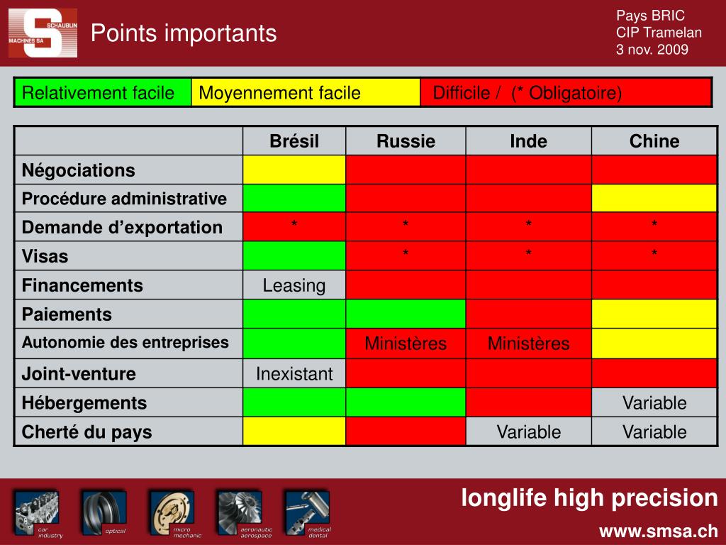Industries au sein des pays du BRIC • Automobile • Aérospatial / aéronautique • Médical, dentaire • Agro-alimentaire • Chimie • Textile • Petro-chimie • Métallurgie (aciérie) • Construction naval • Electroménager • Armement • Electronique • Micromécanique • Optique • Machine-outil • Etc…