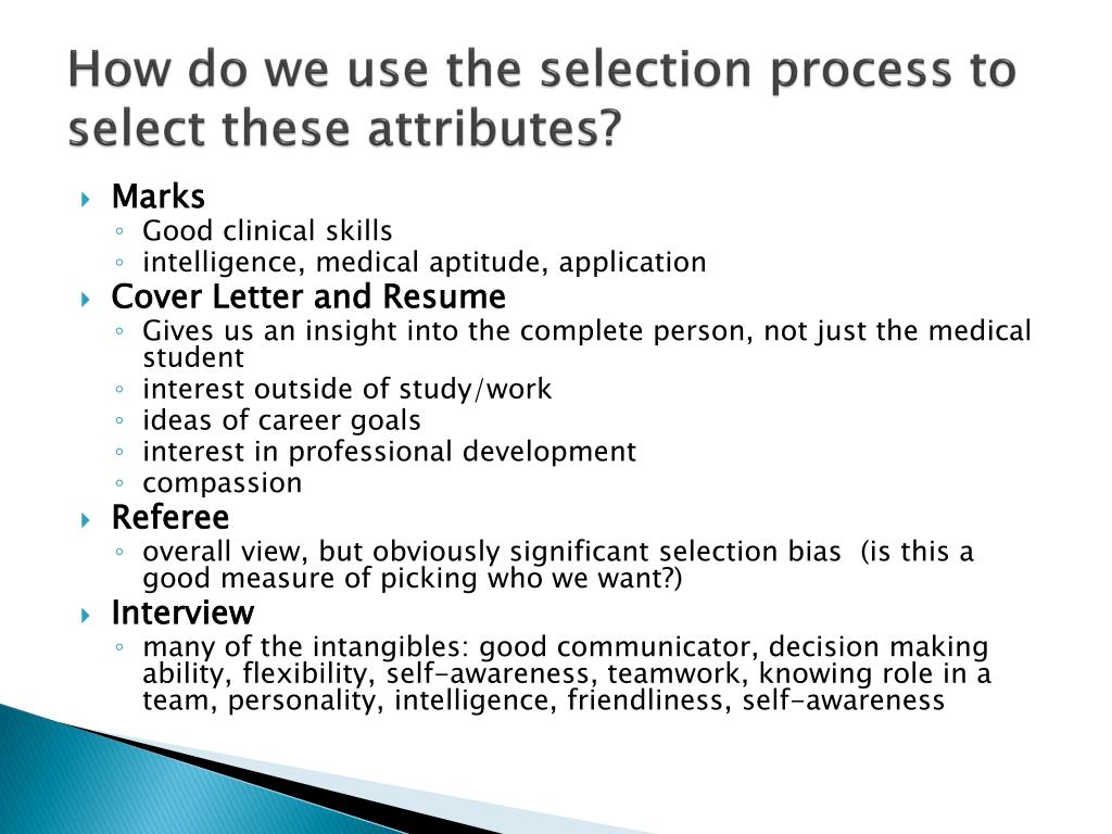 How do we use the selection process to select these attributes? • Marks • Good clinical skills • intelligence, medical aptitude, application • Cover Letter and Resume • Gives us an insight into the complete person, not just the medical student • interest outside of study/work • ideas of career goals • interest in professional development • compassion • Referee • overall view, but obviously significant selection bias (is this a good measure of picking who we want?) • Interview • many of the intangibles: good communicator, decision making ability, flexibility, self-awareness, teamwork, knowing role in a team, personality, intelligence, friendliness, self-awareness