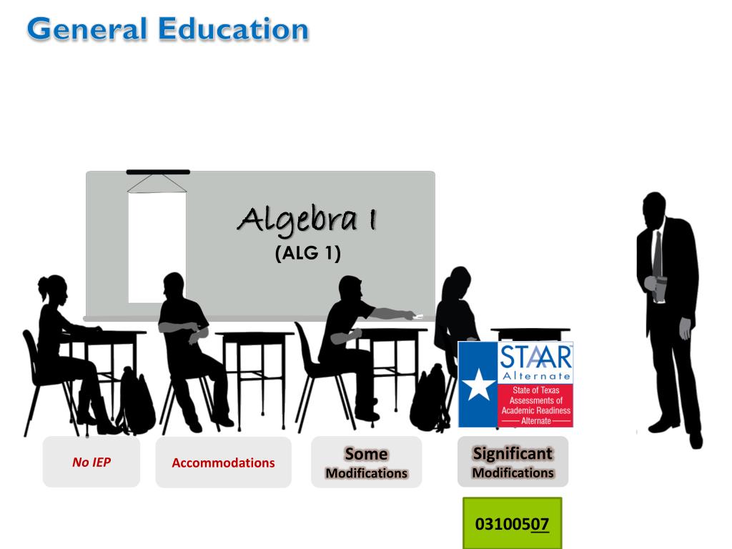 GeneralEducation Algebra I (ALG 1) No IEP Some Modifications Significant Modifications Accommodations 03100507