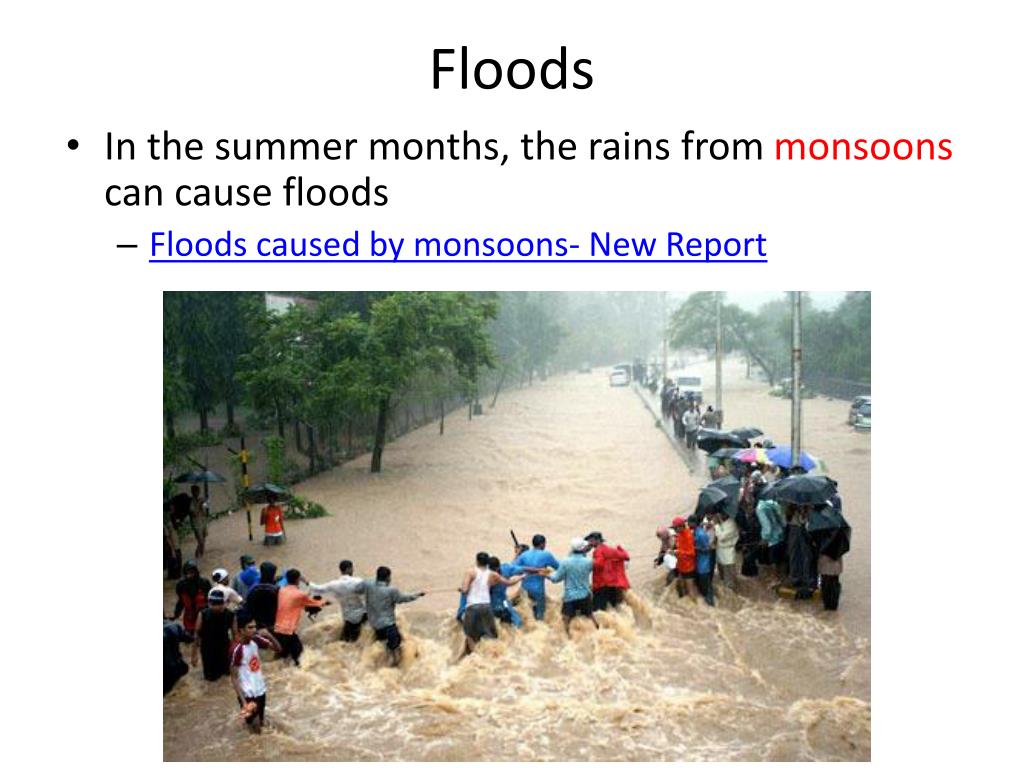 Floods • In the summer months, the rains from monsoons can cause floods • Floods caused by monsoons- New Report