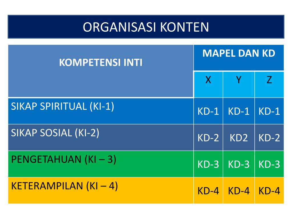 KOMPETENSI INTI (KI) DALAM KURIKULUM 2013 • KI SATU : SIKAP SPIRITUAL • KI DUA : SIKAP SOSIAL • KI TIGA : PENGETAHUAN • KI EMPAT : KETERAMPILAN • Berlaku semua untuk semua mata pelajaran, jenis, satuan, dan tingkat pendidikan dasar dan sekolah menengah. • Semua KI ditulis/disalin dalam RPP