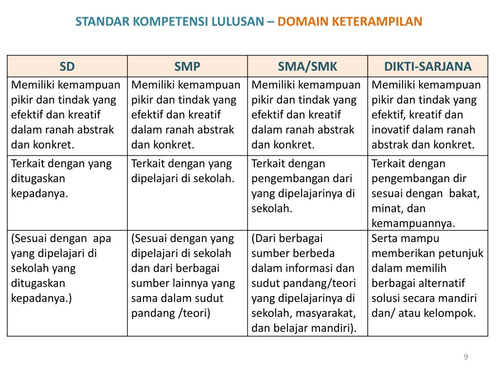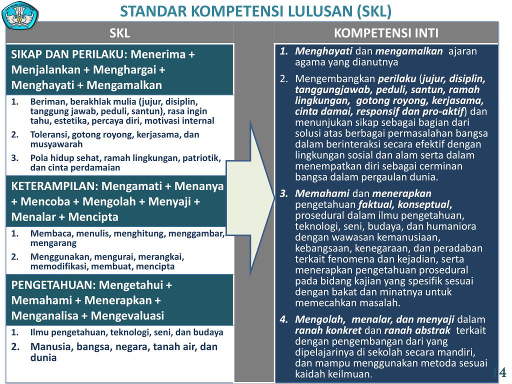 StandarKompetensiLulusan SIKAP • Memiliki perilaku yang mencerminkan sikap. • Orang yang beriman, berakhlak mulia, percaya diri, dan bertanggung jawab dalam berinteraksi secara efektif dengan lingkungan sosial dan alam. • Serta dalam menempatkan dirinya sebagai cerminan bangsa dalam pergaulan dunia. • Memiliki kemampuan pikir dan tindak yang efektif dan kreatif dalam ranah abstrak dan konkret. • Terkait dengan pengembangan dari yang dipelajarinya di sekolah sesuaidenganbakat, minat, dankemampuannya. KETERAMPILAN • Memiliki Pengetahuan Prosedural dan Metakognitif dalamilmu pengetahuan, teknologi, seni, budaya, humaniora, dengan wawasan kebangsaan, kenegaraan, dan peradaban. • Terkait penyebab fenomena dan kejadian yang tampak mata yang mencakuppenyebab, alternatifsolusi, kendaladansolusiakhir. PENGETAHUAN