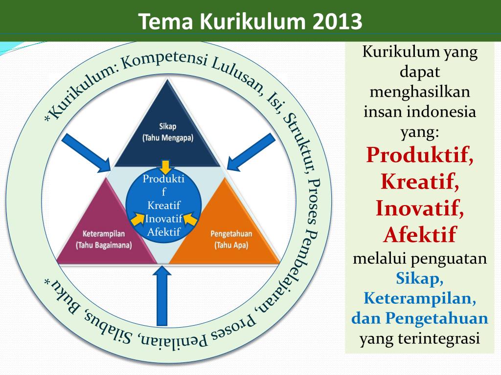 *Kurikulum: Kompetensi Lulusan, Isi, Struktur, Proses Pembelajaran,Proses Penilaian, Silabus, Buku* Tema Kurikulum 2013 Kurikulum yang dapat menghasilkan insan indonesia yang: Produktif, Kreatif, Inovatif, Afektif melalui penguatan Sikap, Keterampilan, dan Pengetahuan yang terintegrasi Produktif Kreatif Inovatif Afektif