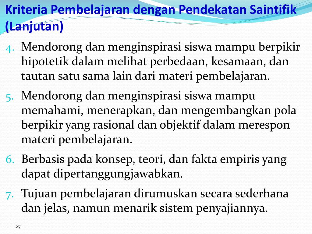 Kriteria Pembelajaran dengan Pendekatan Saintifik (Lanjutan) • Mendorong dan menginspirasi siswa mampu berpikir hipotetik dalam melihat perbedaan, kesamaan, dan tautan satu sama lain dari materi pembelajaran. • Mendorong dan menginspirasi siswa mampu memahami, menerapkan, dan mengembangkan pola berpikir yang rasional dan objektif dalam merespon materi pembelajaran. • Berbasis pada konsep, teori, dan fakta empiris yang dapat dipertanggungjawabkan. • Tujuan pembelajaran dirumuskan secara sederhana dan jelas, namun menarik sistem penyajiannya.