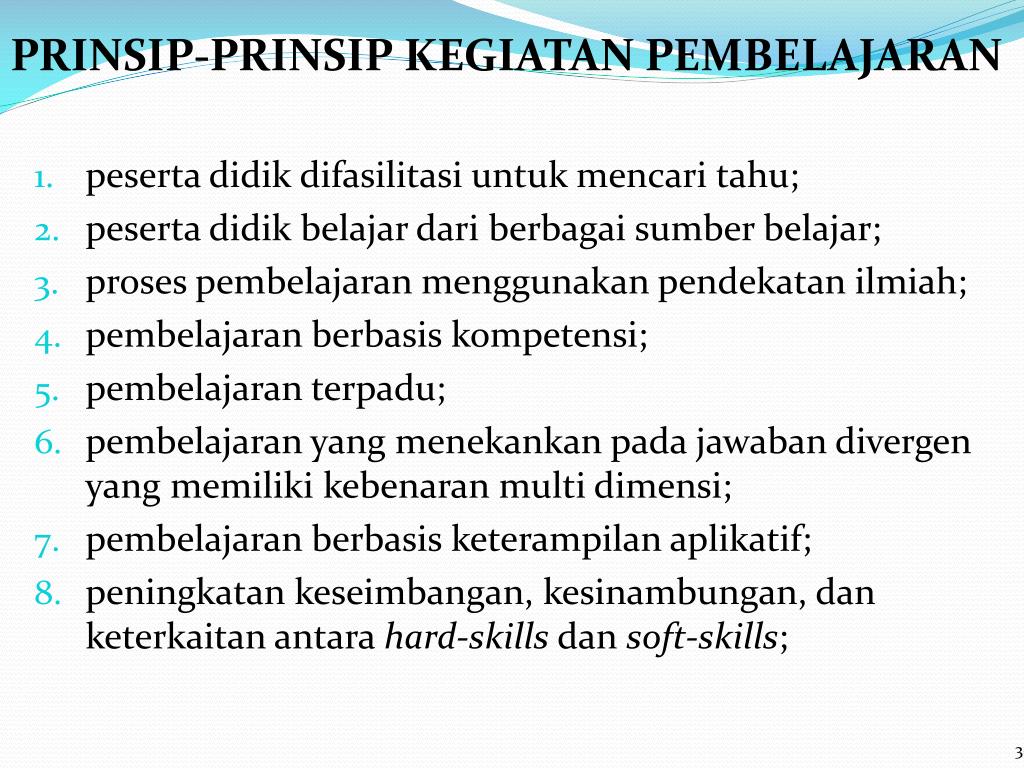PRINSIP-PRINSIP KEGIATAN PEMBELAJARAN • peserta didik difasilitasi untuk mencari tahu; • peserta didik belajar dari berbagai sumber belajar; • proses pembelajaran menggunakan pendekatan ilmiah; • pembelajaran berbasis kompetensi; • pembelajaran terpadu; • pembelajaran yang menekankan pada jawaban divergen yang memiliki kebenaran multi dimensi; • pembelajaran berbasis keterampilan aplikatif; • peningkatan keseimbangan, kesinambungan, dan keterkaitan antara hard-skills dan soft-skills;
