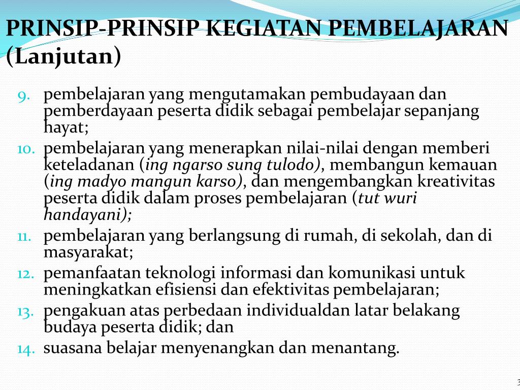 PRINSIP-PRINSIP KEGIATAN PEMBELAJARAN (Lanjutan) • pembelajaran yang mengutamakan pembudayaan dan pemberdayaan peserta didik sebagai pembelajar sepanjang hayat; • pembelajaran yang menerapkan nilai-nilai dengan memberi keteladanan (ing ngarso sung tulodo), membangun kemauan (ing madyo mangun karso), dan mengembangkan kreativitas peserta didik dalam proses pembelajaran (tut wuri handayani); • pembelajaran yang berlangsung di rumah, di sekolah, dan di masyarakat; • pemanfaatan teknologi informasi dan komunikasi untuk meningkatkan efisiensi dan efektivitas pembelajaran; • pengakuan atas perbedaan individualdan latar belakang budaya peserta didik; dan • suasana belajar menyenangkan dan menantang.