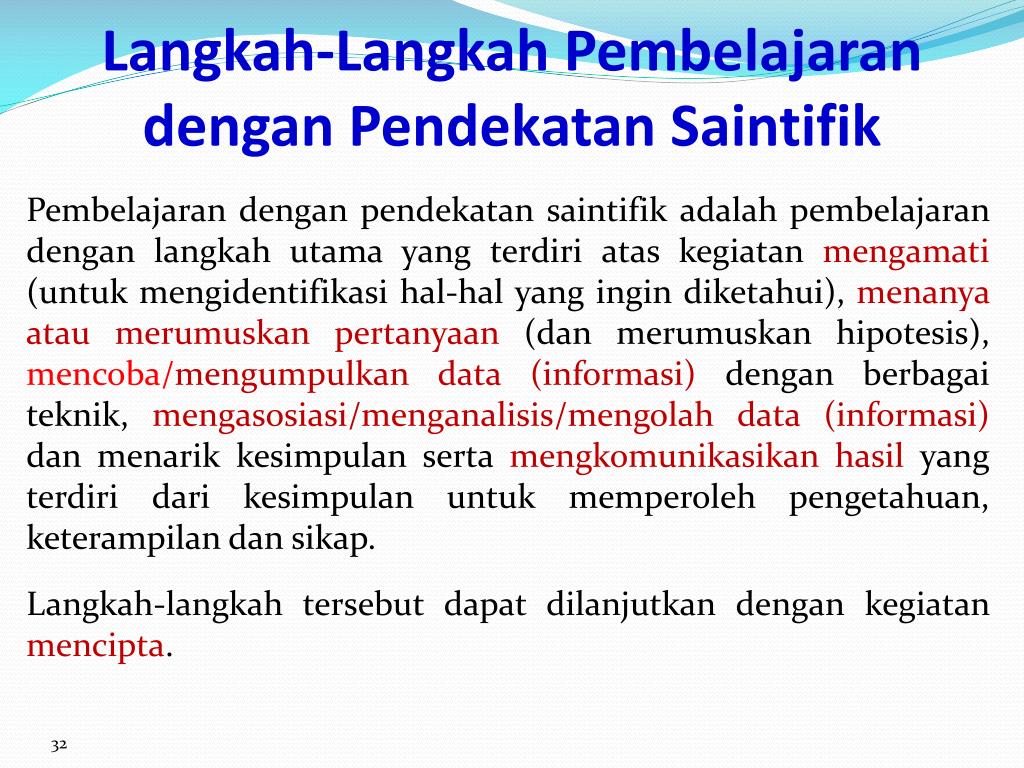 Langkah-Langkah Pembelajaran dengan Pendekatan Saintifik Pembelajarandenganpendekatansaintifikadalahpembelajarandengan langkah utama yang terdiriataskegiatanmengamati (untukmengidentifikasihal-hal yang ingin diketahui), menanya atau merumuskanpertanyaan (dan merumuskanhipotesis), mencoba/mengumpulkan data (informasi) denganberbagaiteknik, mengasosiasi/menganalisis/mengolah data (informasi)danmenarikkesimpulansertamengkomunikasikanhasilyang terdiridarikesimpulanuntukmemperolehpengetahuan, keterampilandansikap. Langkah-langkah tersebut dapat dilanjutkan dengan kegiatanmencipta.