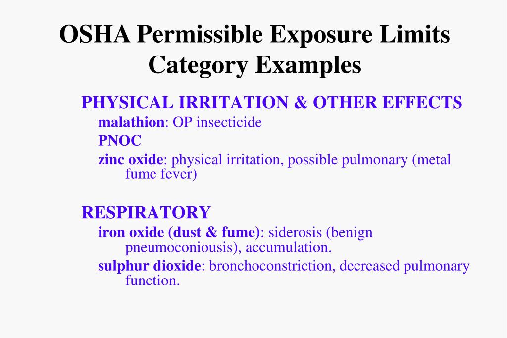 OSHA Permissible Exposure Limits Category Examples PHYSICAL IRRITATION & OTHER EFFECTS malathion: OP insecticide PNOC zinc oxide: physical irritation, possible pulmonary (metal fume fever) RESPIRATORY iron oxide (dust & fume):siderosis (benign pneumoconiousis), accumulation. sulphur dioxide: bronchoconstriction, decreased pulmonary function.