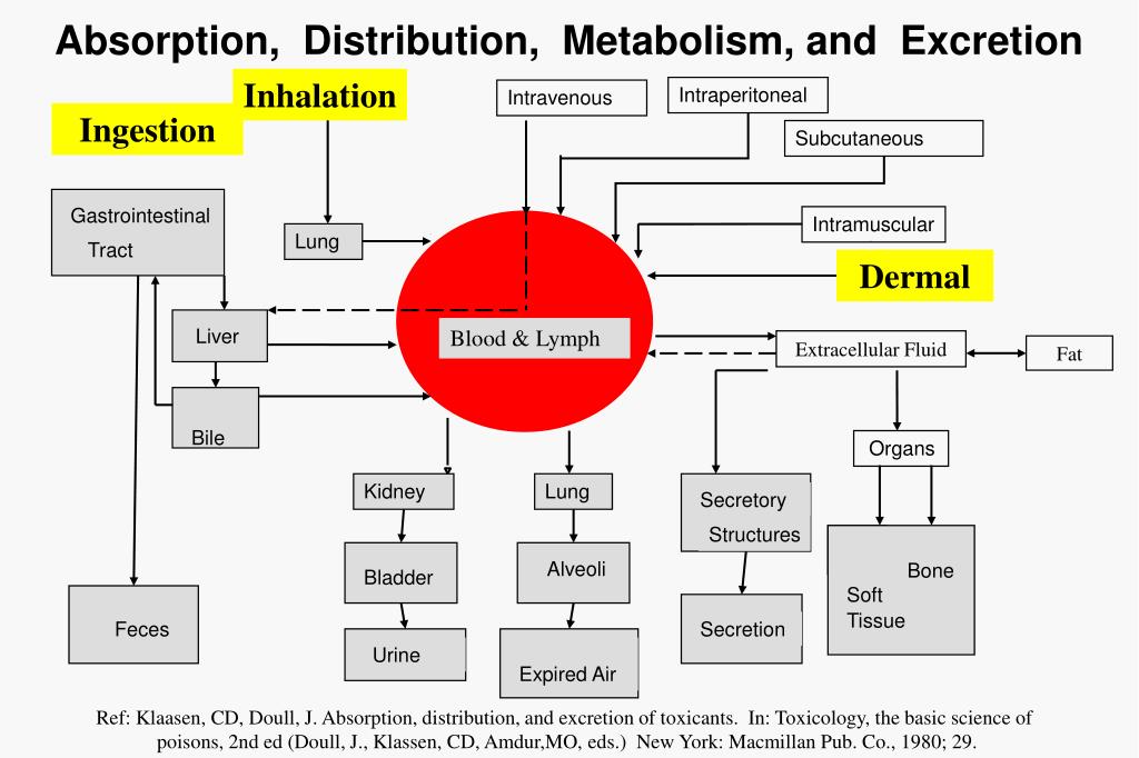 Absorption, Distribution, Metabolism, and Excretion Inhalation Intraperitoneal Intravenous Ingestion Subcutaneous Gastrointestinal Intramuscular Lung Tract Dermal Liver Blood & Lymph Extracellular Fluid Fat Bile Organs Kidney Lung Secretory Structures Bone Alveoli Bladder Soft Tissue Feces Secretion Urine Expired Air Ref: Klaasen, CD, Doull, J. Absorption, distribution, and excretion of toxicants. In: Toxicology, the basic science of poisons, 2nd ed (Doull, J., Klassen, CD, Amdur,MO, eds.) New York: Macmillan Pub. Co., 1980; 29.