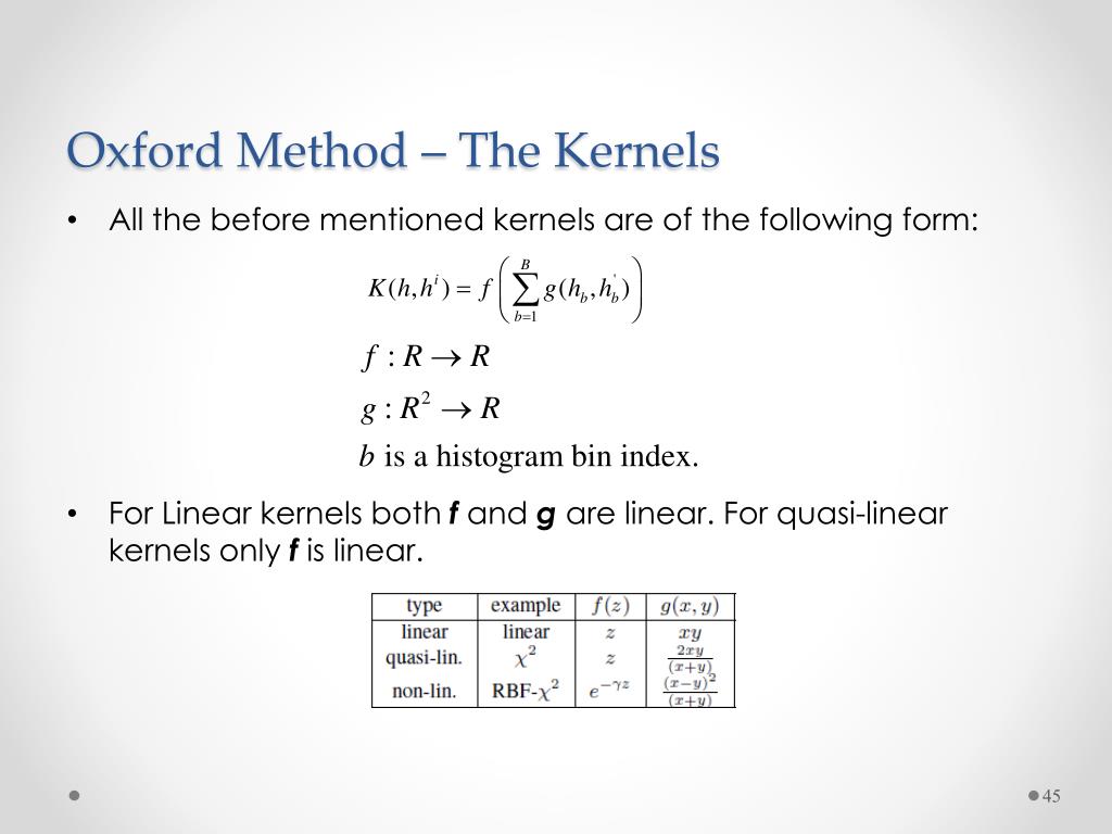 Oxford Method – The Kernels • All the before mentioned kernels are of the following form: • For Linear kernels both f and g are linear. For quasi-linear kernels only f is linear.