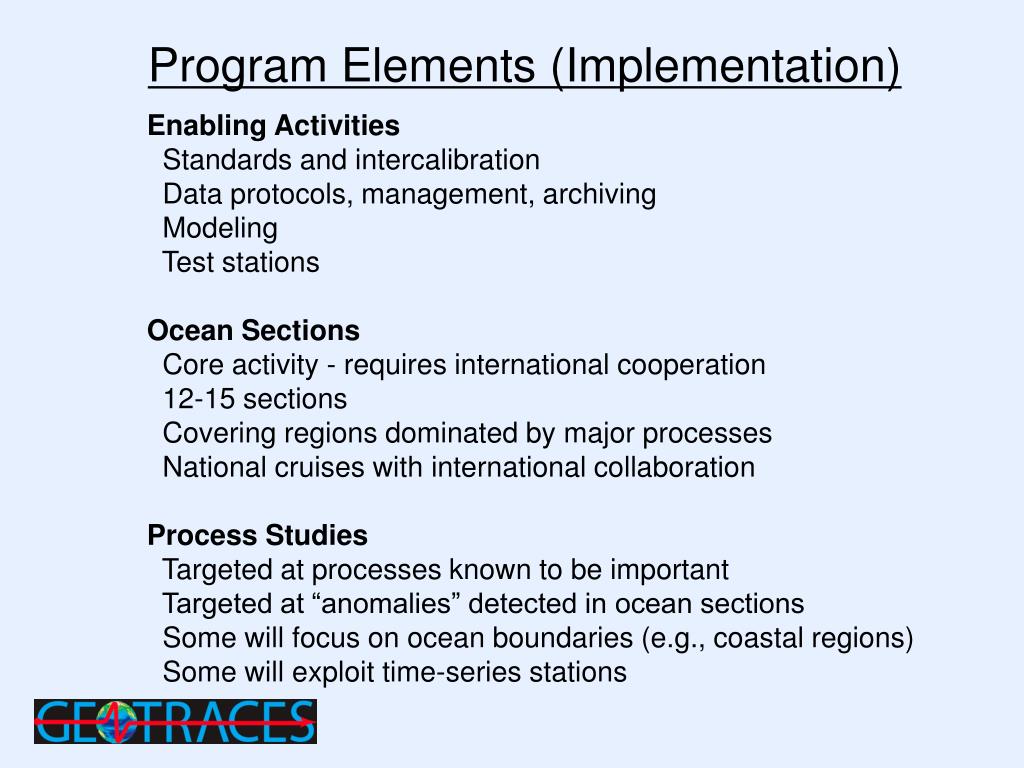 Enabling Activities Standards and intercalibration Data protocols, management, archiving Modeling Test stations Ocean Sections Core activity - requires international cooperation 12-15 sections Covering regions dominated by major processes National cruises with international collaboration Process Studies Targeted at processes known to be important Targeted at “anomalies” detected in ocean sections Some will focus on ocean boundaries (e.g., coastal regions) Some will exploit time-series stations Program Elements (Implementation)