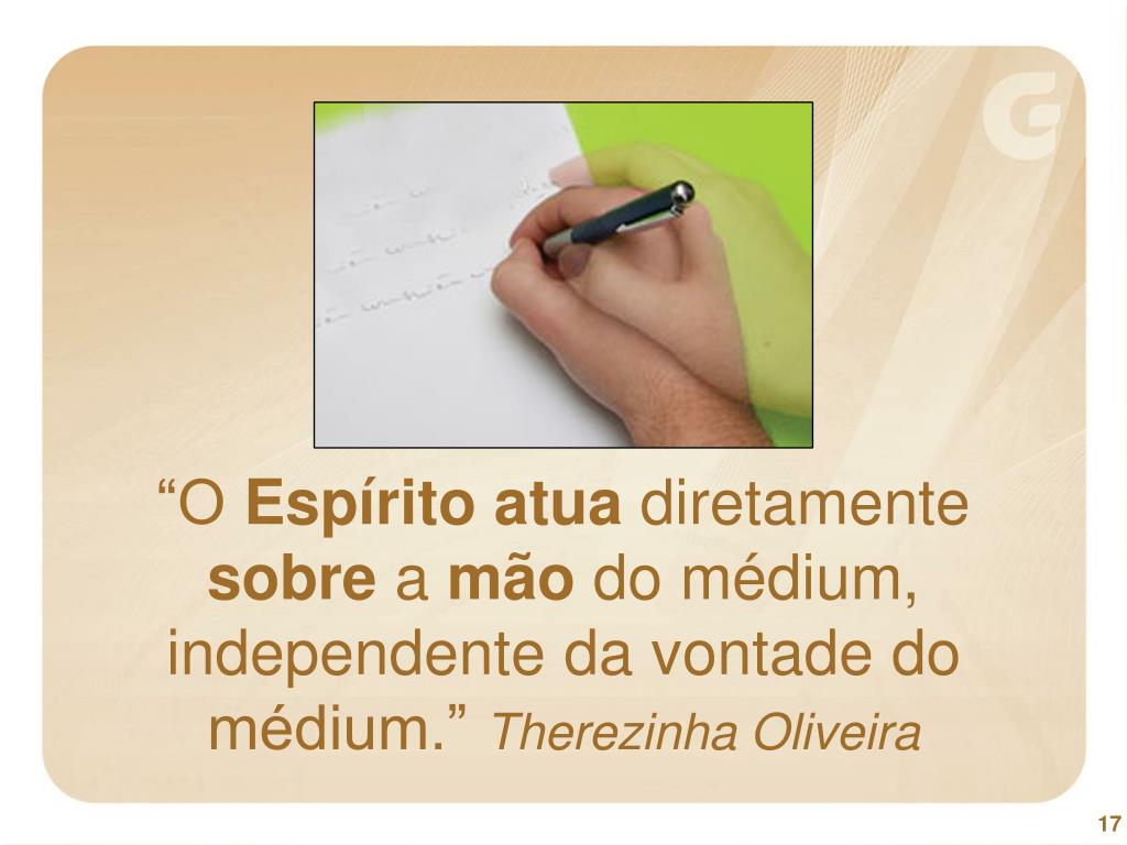 “O Espíritoatua diretamente sobre a mão do médium, independente da vontade do médium.” Therezinha Oliveira 17