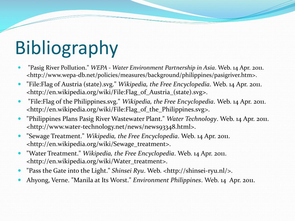 Bibliography • "Pasig River Pollution." WEPA - Water Environment Partnership in Asia. Web. 14 Apr. 2011. <http://www.wepa-db.net/policies/measures/background/philippines/pasigriver.htm>. • "File:Flag of Austria (state).svg." Wikipedia, the Free Encyclopedia. Web. 14 Apr. 2011. <http://en.wikipedia.org/wiki/File:Flag_of_Austria_(state).svg>. • "File:Flag of the Philippines.svg." Wikipedia, the Free Encyclopedia. Web. 14 Apr. 2011. <http://en.wikipedia.org/wiki/File:Flag_of_the_Philippines.svg>. • "Philippines Plans Pasig River Wastewater Plant." Water Technology. Web. 14 Apr. 2011. <http://www.water-technology.net/news/news93348.html>. • "Sewage Treatment." Wikipedia, the Free Encyclopedia. Web. 14 Apr. 2011. <http://en.wikipedia.org/wiki/Sewage_treatment>. • "Water Treatment." Wikipedia, the Free Encyclopedia. Web. 14 Apr. 2011. <http://en.wikipedia.org/wiki/Water_treatment>. • "Pass the Gate into the Light." ShinseiRyu. Web. <http://shinsei-ryu.nl/>. • Ahyong, Verne. "Manila at Its Worst." Environment Philippines. Web. 14 Apr. 2011.