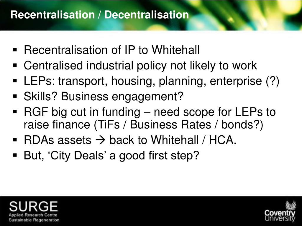 Recentralisation / Decentralisation • Recentralisation of IP to Whitehall • Centralised industrial policy not likely to work • LEPs: transport, housing, planning, enterprise (?) • Skills? Business engagement? • RGF big cut in funding – need scope for LEPs to raise finance (TiFs / Business Rates / bonds?) • RDAs assets back to Whitehall / HCA. • But, ‘City Deals’ a good first step?