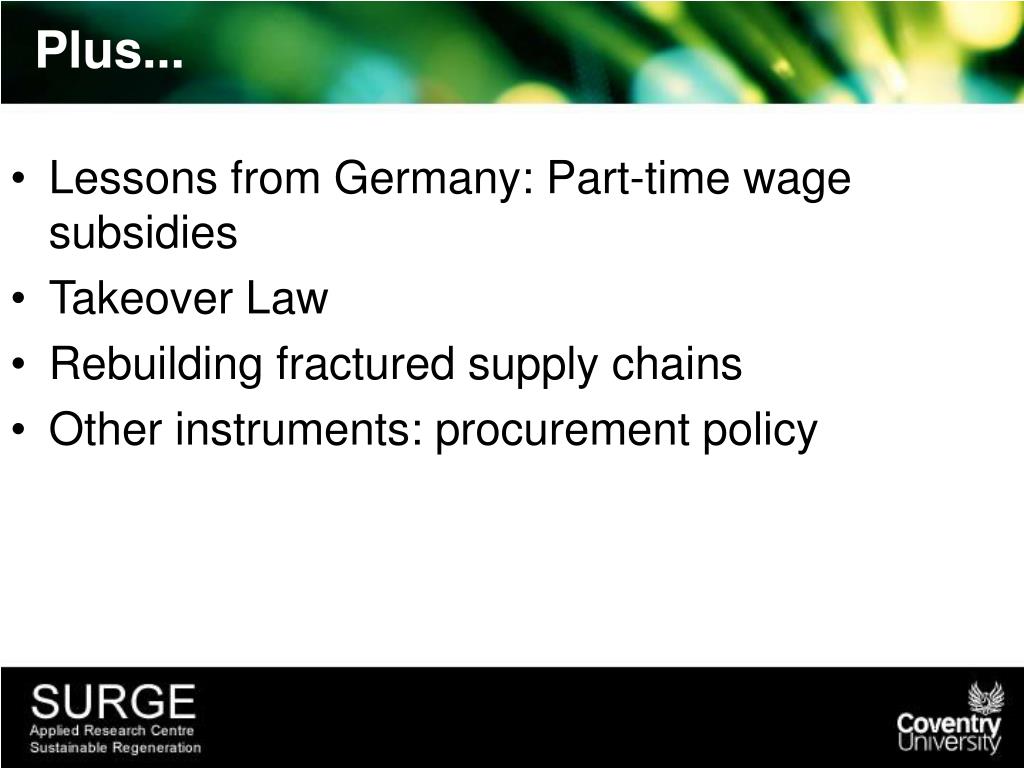 Plus... • Lessons from Germany: Part-time wage subsidies • Takeover Law • Rebuilding fractured supply chains • Other instruments: procurement policy
