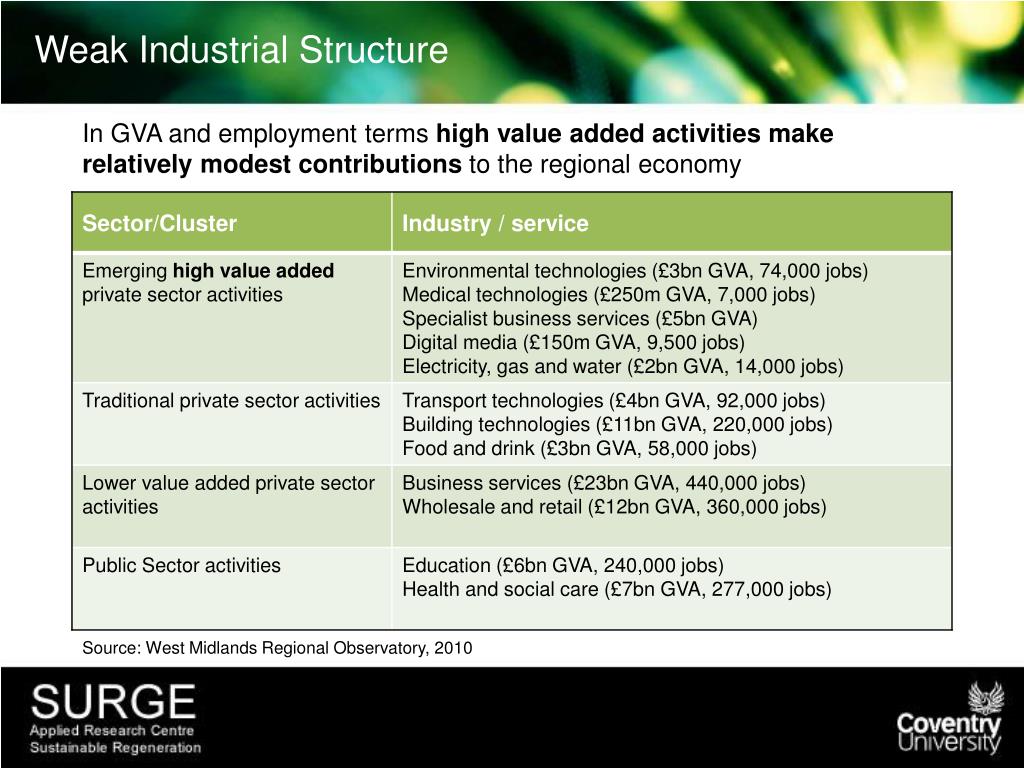 Weak Industrial Structure In GVA and employment terms high value added activities make relatively modest contributions to the regional economy Source: West Midlands Regional Observatory, 2010