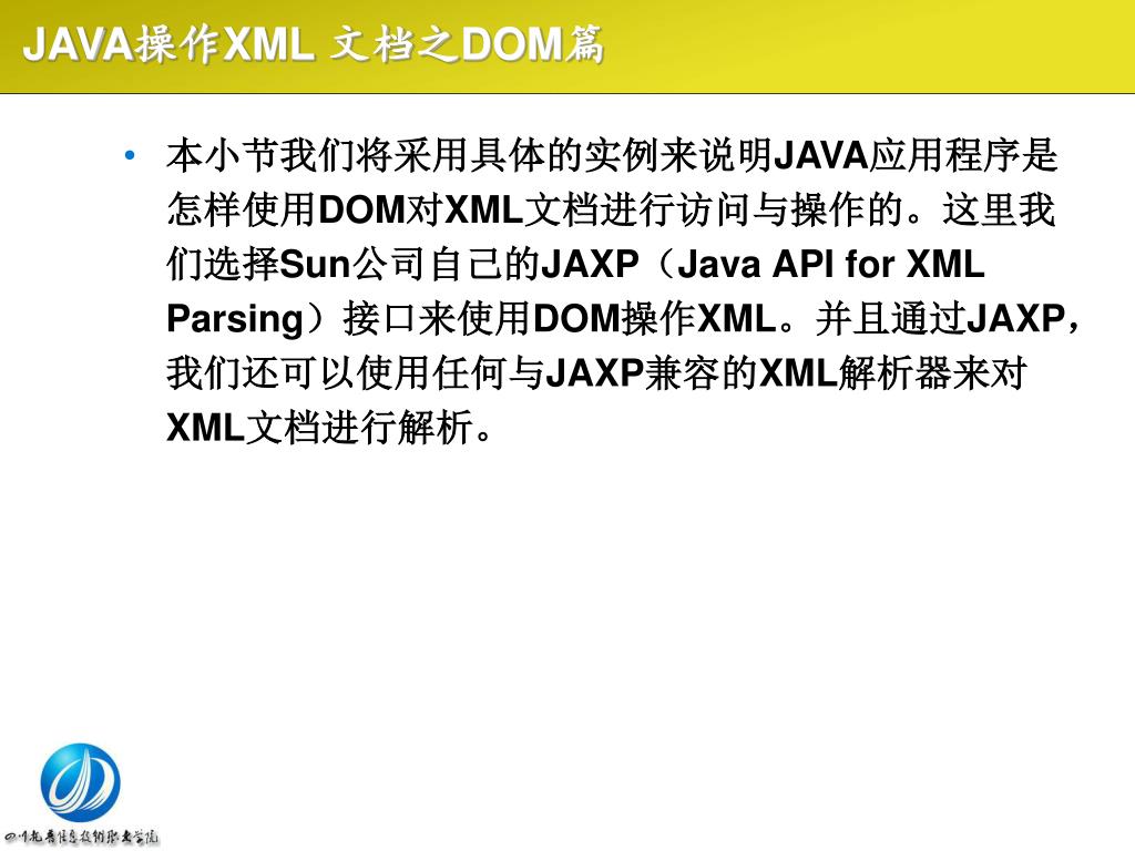 JAVA操作XML 文档之DOM篇 • 本小节我们将采用具体的实例来说明JAVA应用程序是怎样使用DOM对XML文档进行访问与操作的。这里我们选择Sun公司自己的JAXP(Java API for XML Parsing)接口来使用DOM操作XML。并且通过JAXP,我们还可以使用任何与JAXP兼容的XML解析器来对XML文档进行解析。