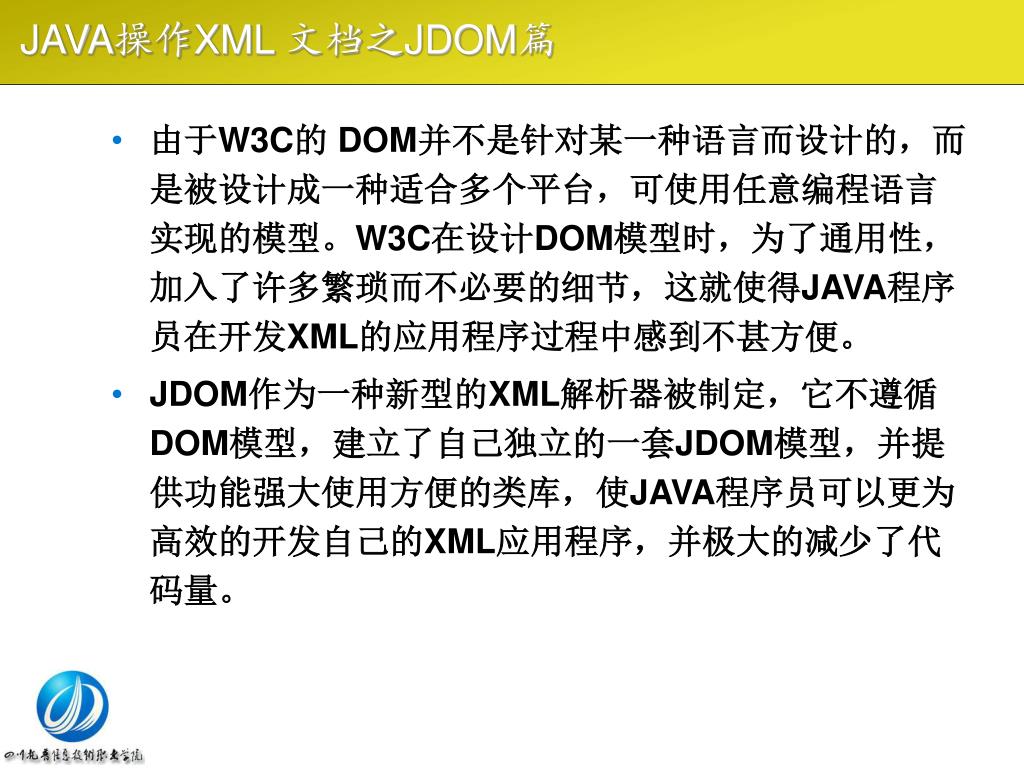 JAVA操作XML 文档之JDOM篇 • 由于W3C的 DOM并不是针对某一种语言而设计的,而是被设计成一种适合多个平台,可使用任意编程语言实现的模型。W3C在设计DOM模型时,为了通用性,加入了许多繁琐而不必要的细节,这就使得JAVA程序员在开发XML的应用程序过程中感到不甚方便。 • JDOM作为一种新型的XML解析器被制定,它不遵循DOM模型,建立了自己独立的一套JDOM模型,并提供功能强大使用方便的类库,使JAVA程序员可以更为高效的开发自己的XML应用程序,并极大的减少了代码量。