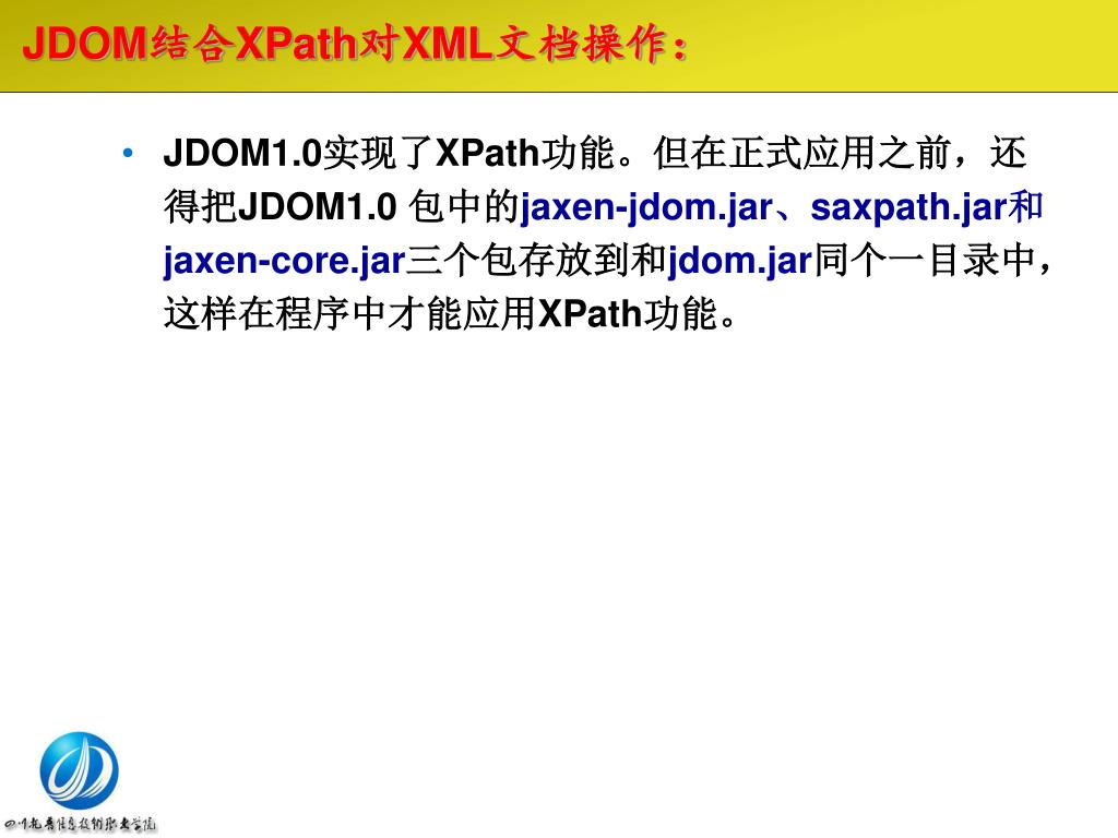 JDOM结合XPath对XML文档操作: • JDOM1.0实现了XPath功能。但在正式应用之前,还得把JDOM1.0 包中的jaxen-jdom.jar、saxpath.jar和jaxen-core.jar三个包存放到和jdom.jar同个一目录中,这样在程序中才能应用XPath功能。