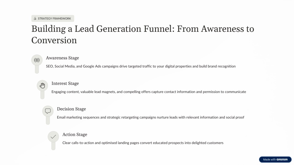 STRATEGY FRAMEWORK Building a Lead Generation Funnel: From Awareness to Conversion Awareness Stage SEO, Social Media, and Google Ads campaigns drive targeted traffic to your digital properties and build brand recognition Interest Stage Engaging content, valuable lead magnets, and compelling offers capture contact information and permission to communicate Decision Stage Email marketing sequences and strategic retargeting campaigns nurture leads with relevant information and social proof Action Stage Clear calls-to-action and optimised landing pages convert educated prospects into delighted customers