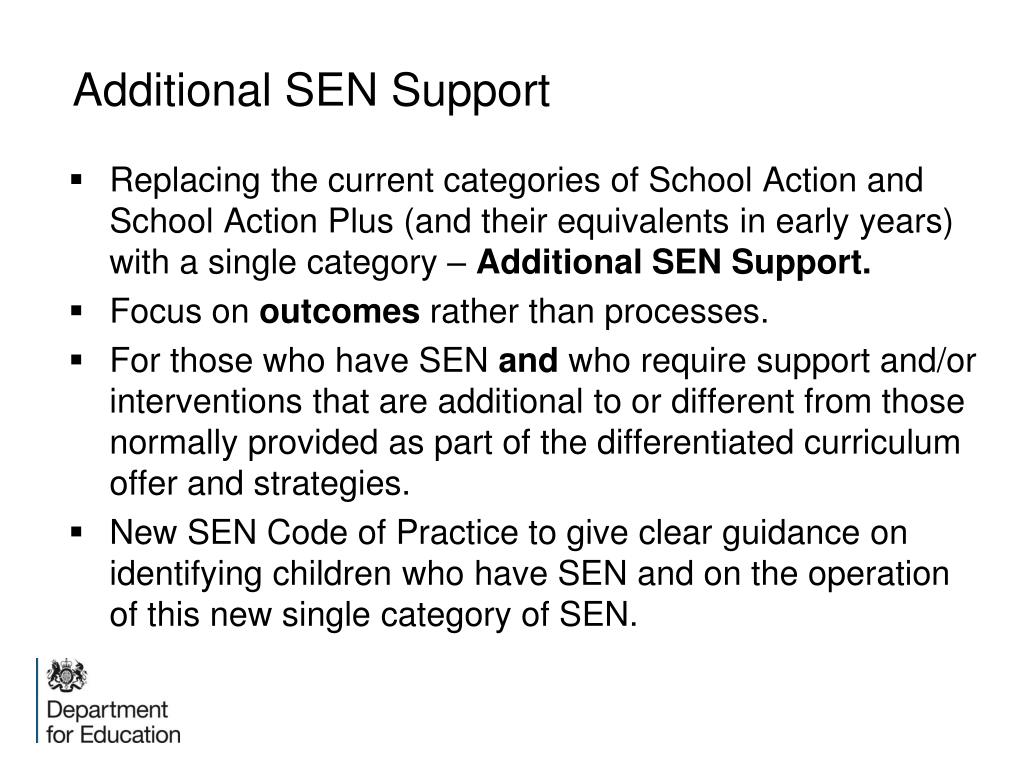 Additional SEN Support • Replacing the current categories of School Action and School Action Plus (and their equivalents in early years) with a single category – Additional SEN Support. • Focus on outcomes rather than processes. • For those who have SEN and who require support and/or interventions that are additional to or different from those normally provided as part of the differentiated curriculum offer and strategies. • New SEN Code of Practice to give clear guidance on identifying children who have SEN and on the operation of this new single category of SEN.