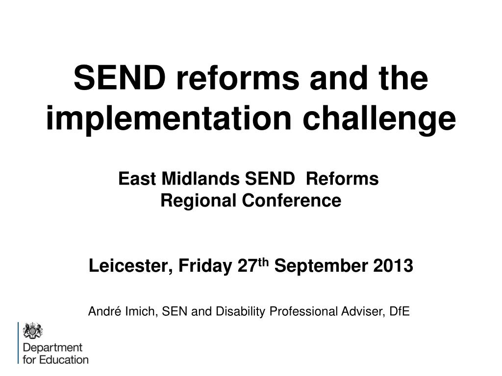 SEND reforms and the implementation challengeEast Midlands SEND Reforms Regional ConferenceLeicester, Friday 27th September 2013 André Imich, SEN and Disability Professional Adviser, DfE