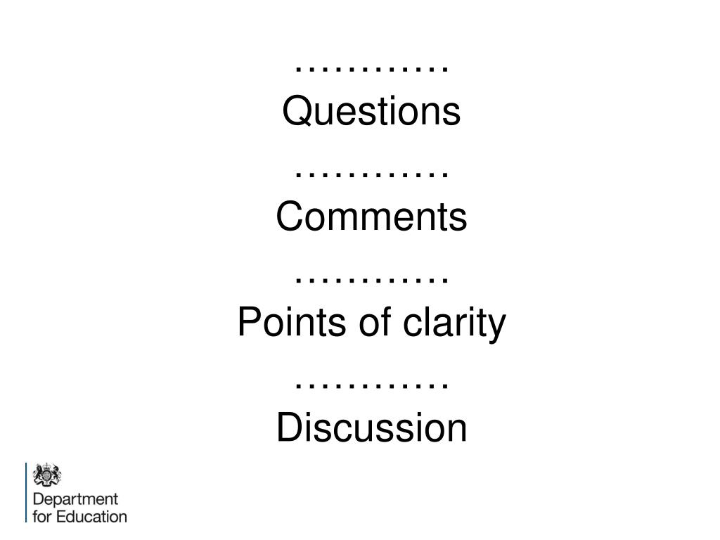 ………… Questions ………… Comments ………… Points of clarity ………… Discussion