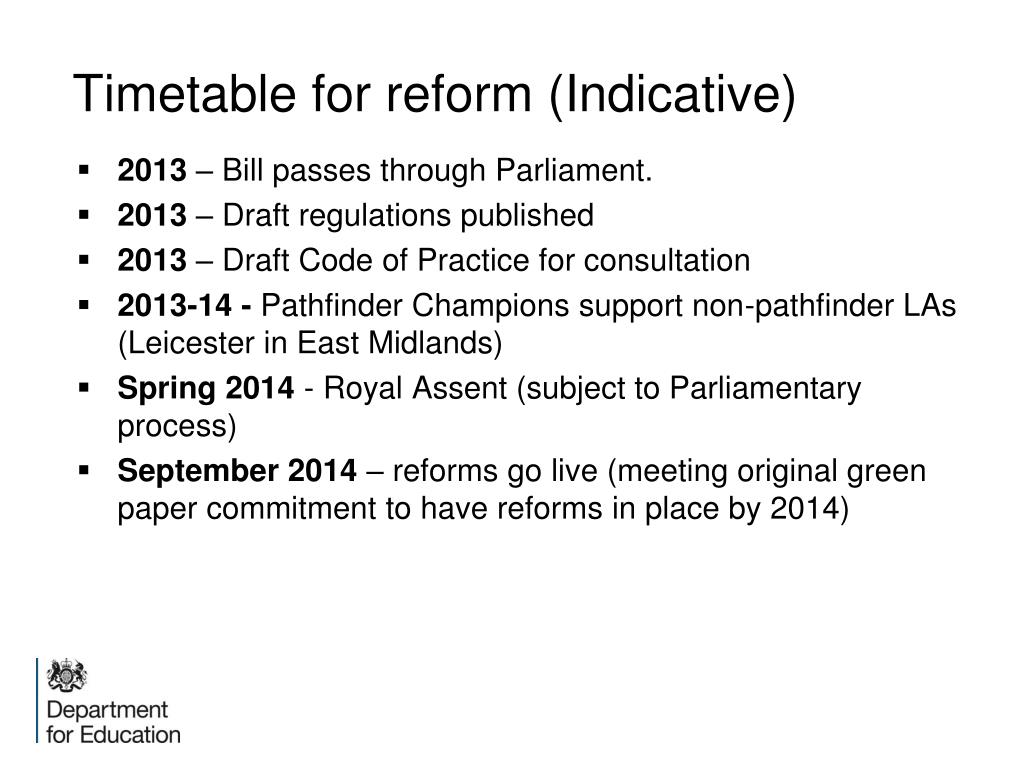 Timetable for reform (Indicative) • 2013 – Bill passes through Parliament. • 2013 – Draft regulations published • 2013 – Draft Code of Practice for consultation • 2013-14 - Pathfinder Champions support non-pathfinder LAs (Leicester in East Midlands) • Spring 2014 - Royal Assent (subject to Parliamentary process) • September 2014 – reforms go live (meeting original green paper commitment to have reforms in place by 2014)