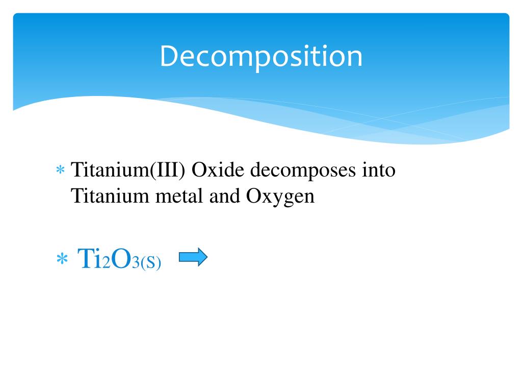 Decomposition Titanium(III) Oxide decomposes into Titanium metal and Oxygen 2Ti2O3(S) 4Ti(S) + 3O2(g) One reactant becomes two or more products.