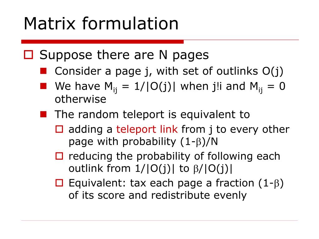 Matrix formulation • Suppose there are N pages • Consider a page j, with set of outlinks O(j) • We have Mij = 1/|O(j)| when j!i and Mij = 0 otherwise • The random teleport is equivalent to • adding a teleport link from j to every other page with probability (1-)/N • reducing the probability of following each outlink from 1/|O(j)| to /|O(j)| • Equivalent: tax each page a fraction (1-) of its score and redistribute evenly