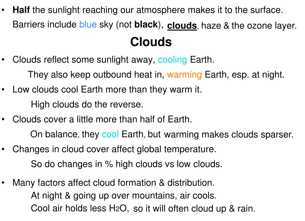Clouds . • Half the sunlight reaching our atmosphere makes it to the surface. Barriers include blue sky (not black), Clouds • Clouds reflect some sunlight away, cooling Earth. They also keep outbound heat in, warming Earth, esp. at night. Low clouds cool Earth more than they warm it. High clouds do the reverse. Clouds cover a little more than half of Earth. On balance, they cool Earth, but Changes in cloud cover affect global temperature. So do changes in % high clouds vs low clouds. • Many factors affect cloud formation & distribution. At night & going up over mountains, air cools. Cool air holds less H2O, clouds, haze&the ozone layer. warming makes clouds sparser. so it will often cloud up & rain.