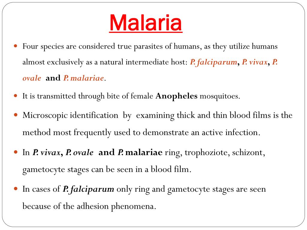 Malaria • Four species are considered true parasites of humans, as they utilize humans almost exclusively as a natural intermediate host: P.falciparum, P. vivax, P. ovale and P. malariae. • It is transmitted through bite of female Anopheles mosquitoes. • Microscopic identification by examining thick and thin blood films is the method most frequently used to demonstrate an active infection. • In P. vivax, P. ovale and P. malariaering, trophoziote, schizont, gametocyte stages can be seen in a blood film. • In cases of P. falciparumonly ring and gametocyte stages are seen because of the adhesion phenomena.