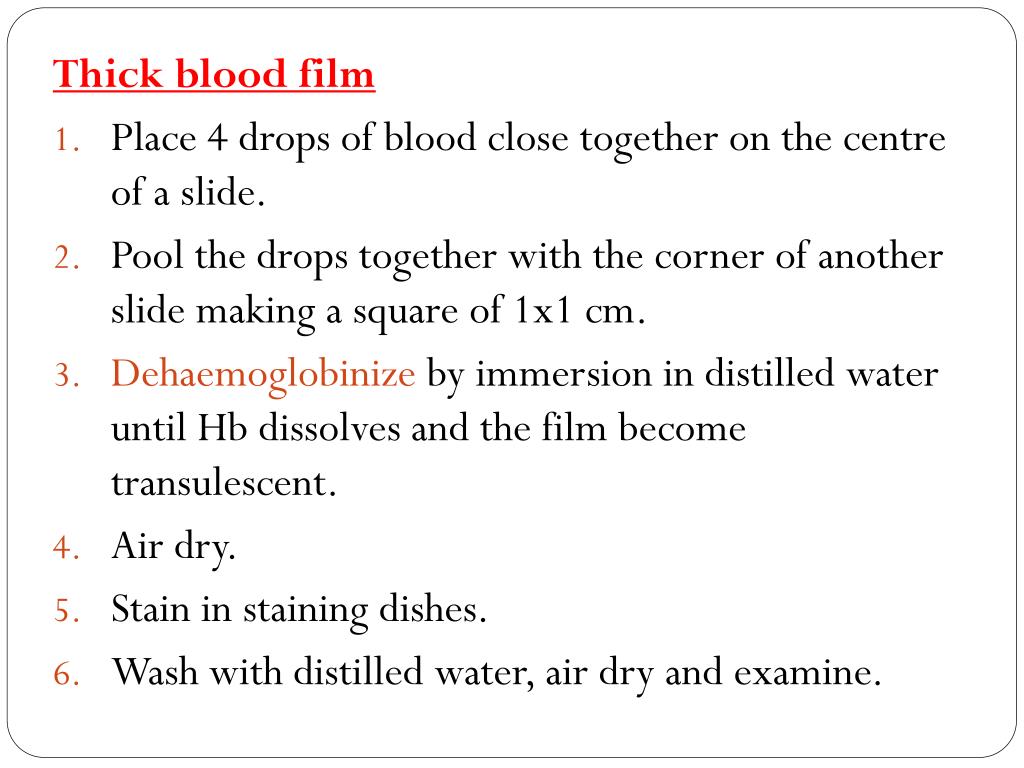 Thick blood film • Place 4 drops of blood close together on the centre of a slide. • Pool the drops together with the corner of another slide making a square of 1x1 cm. • Dehaemoglobinize by immersion in distilled water until Hb dissolves and the film become transulescent. • Air dry. • Stain in staining dishes. • Wash with distilled water, air dry and examine.