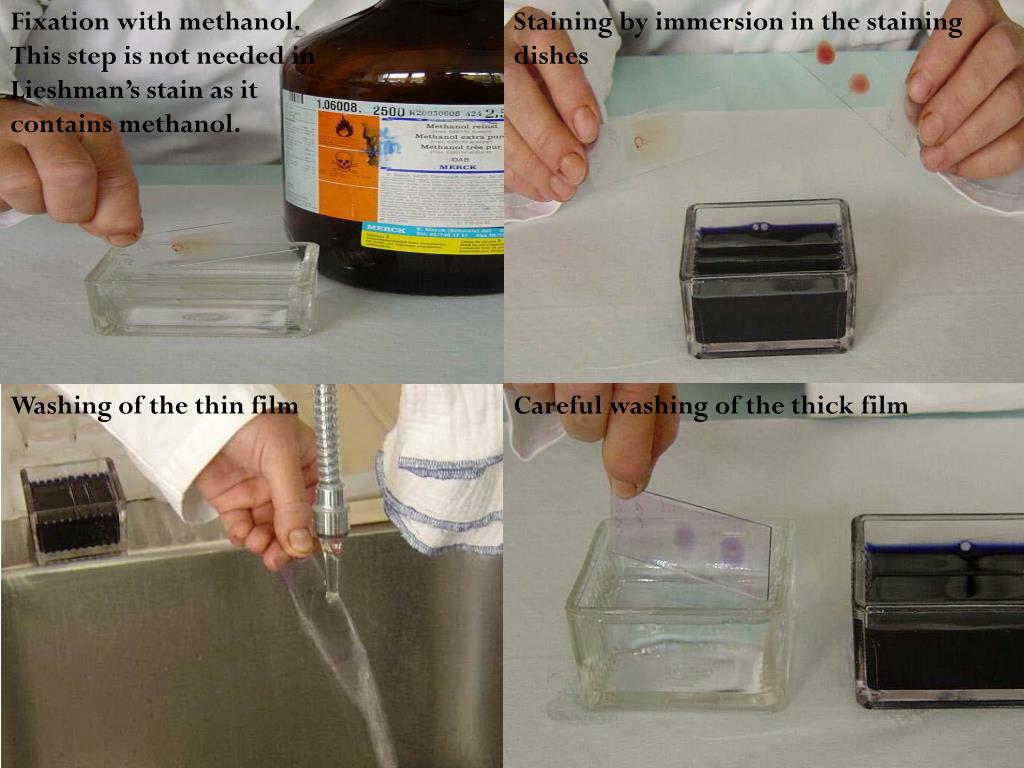 Fixation with methanol. This step is not needed in Lieshman’s stain as it contains methanol. Staining by immersion in the staining dishes Washing of the thin film Careful washing of the thick film